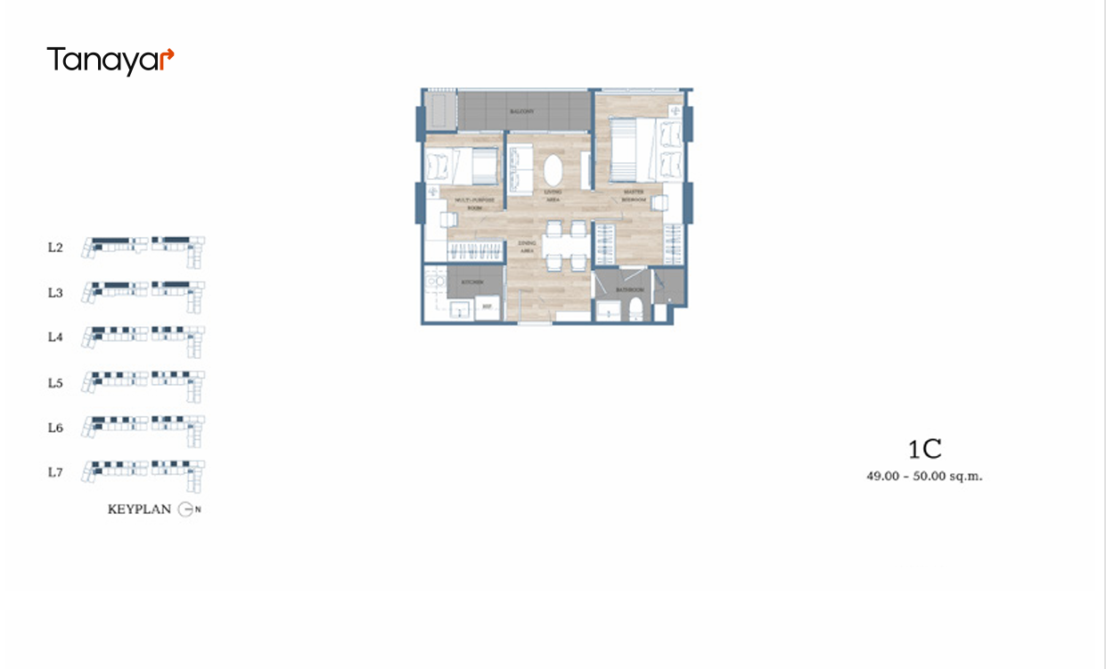 - 1 Bedroom, 1 Bathroom & 1 Multipurpose Room: 49.00 – 50.75 sqm