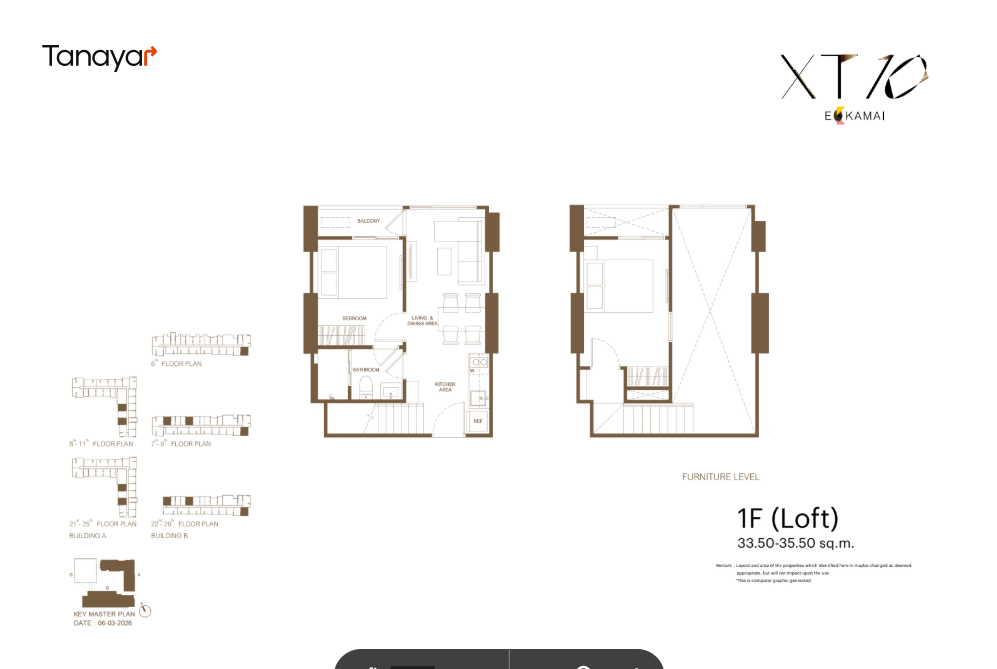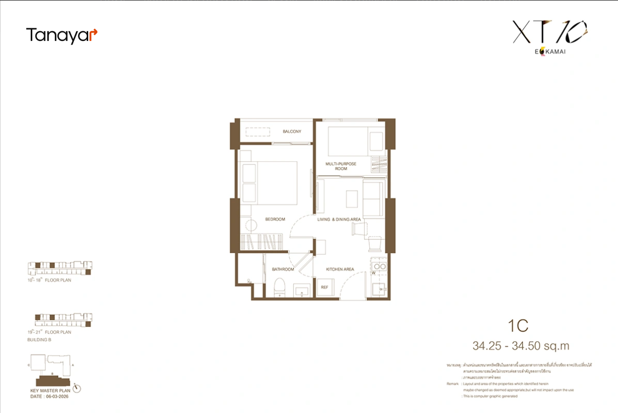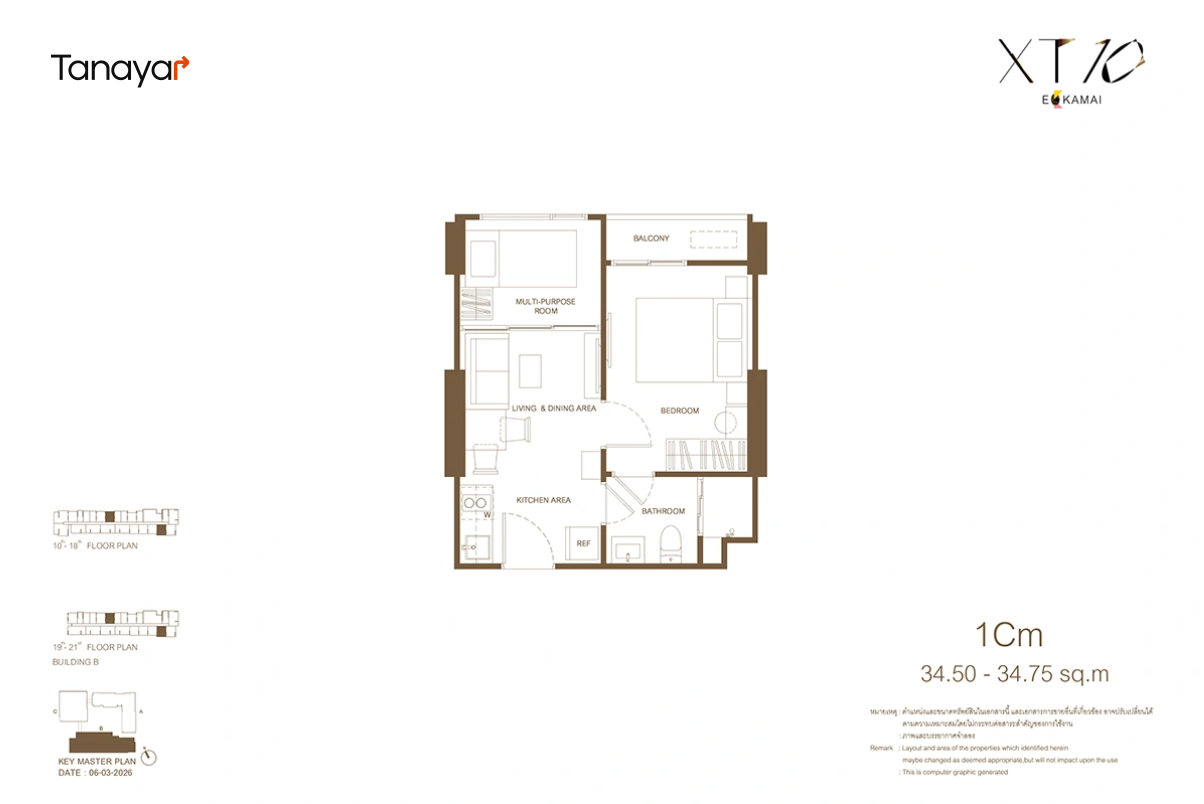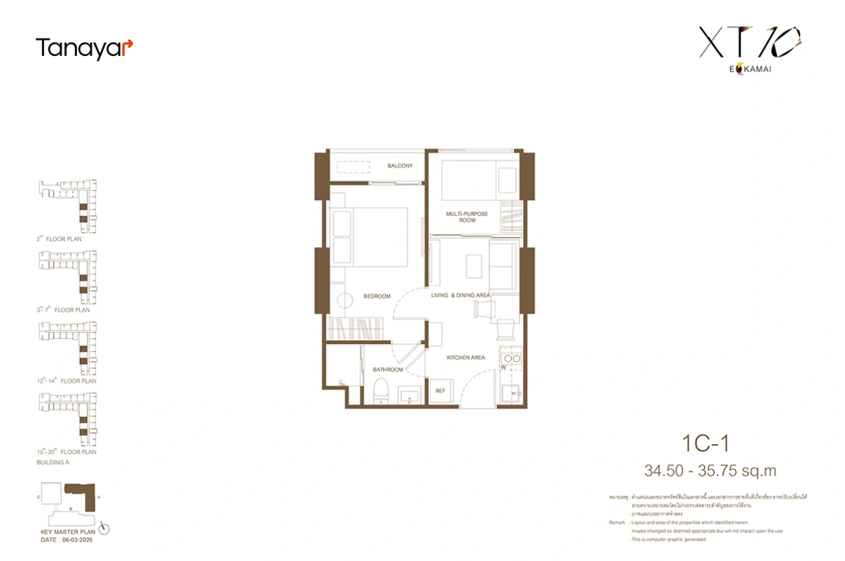 - 1 Bedroom 1 Bathroom 1 Multipurpose: 34.25 – 35.75 sqm